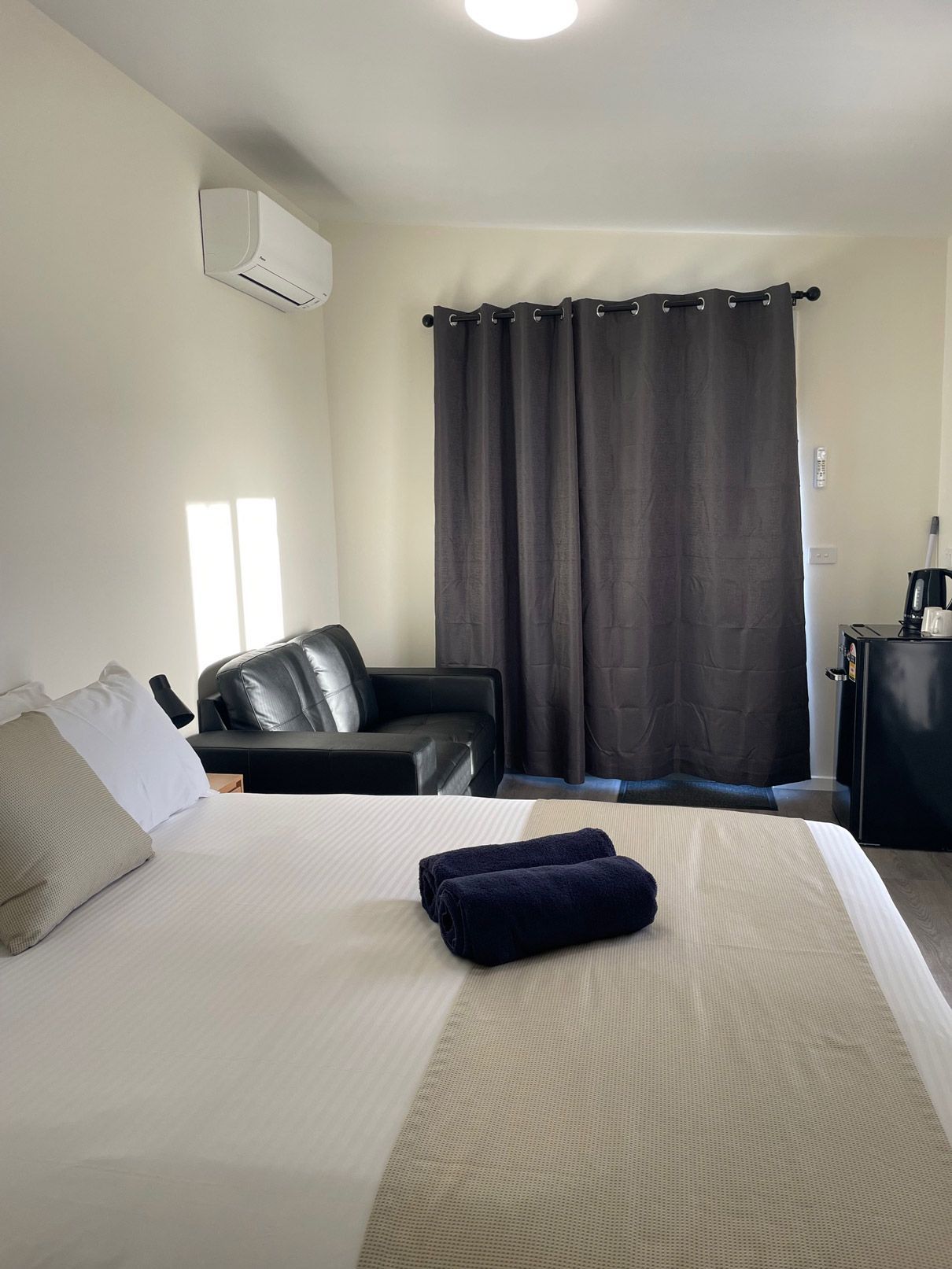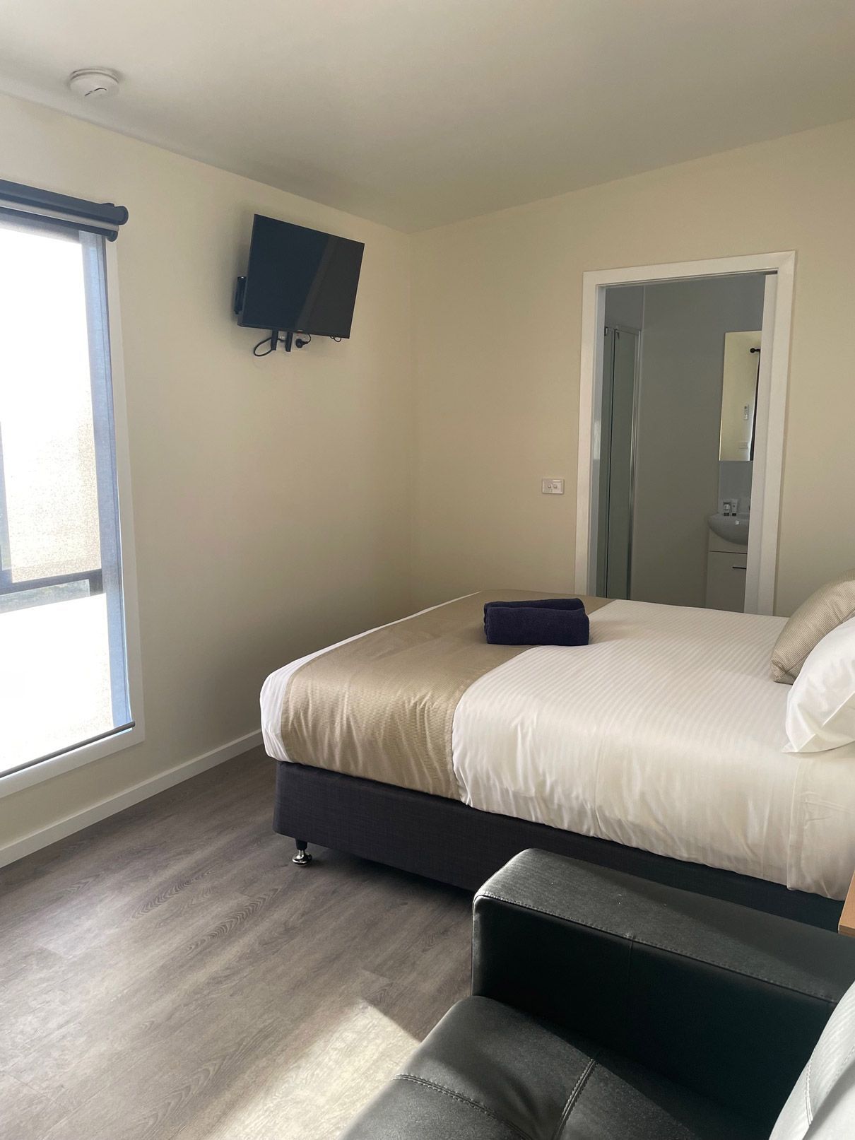 - This cabin is ideal for a couple or singles. Open plan with queen bed and ensuite, bar fridge, tea / coffee making facilities, (no cooking facilities can use camp Kitchen), TV , couch, reverse cycle air con, front verandah with sitting area and pet friendly
