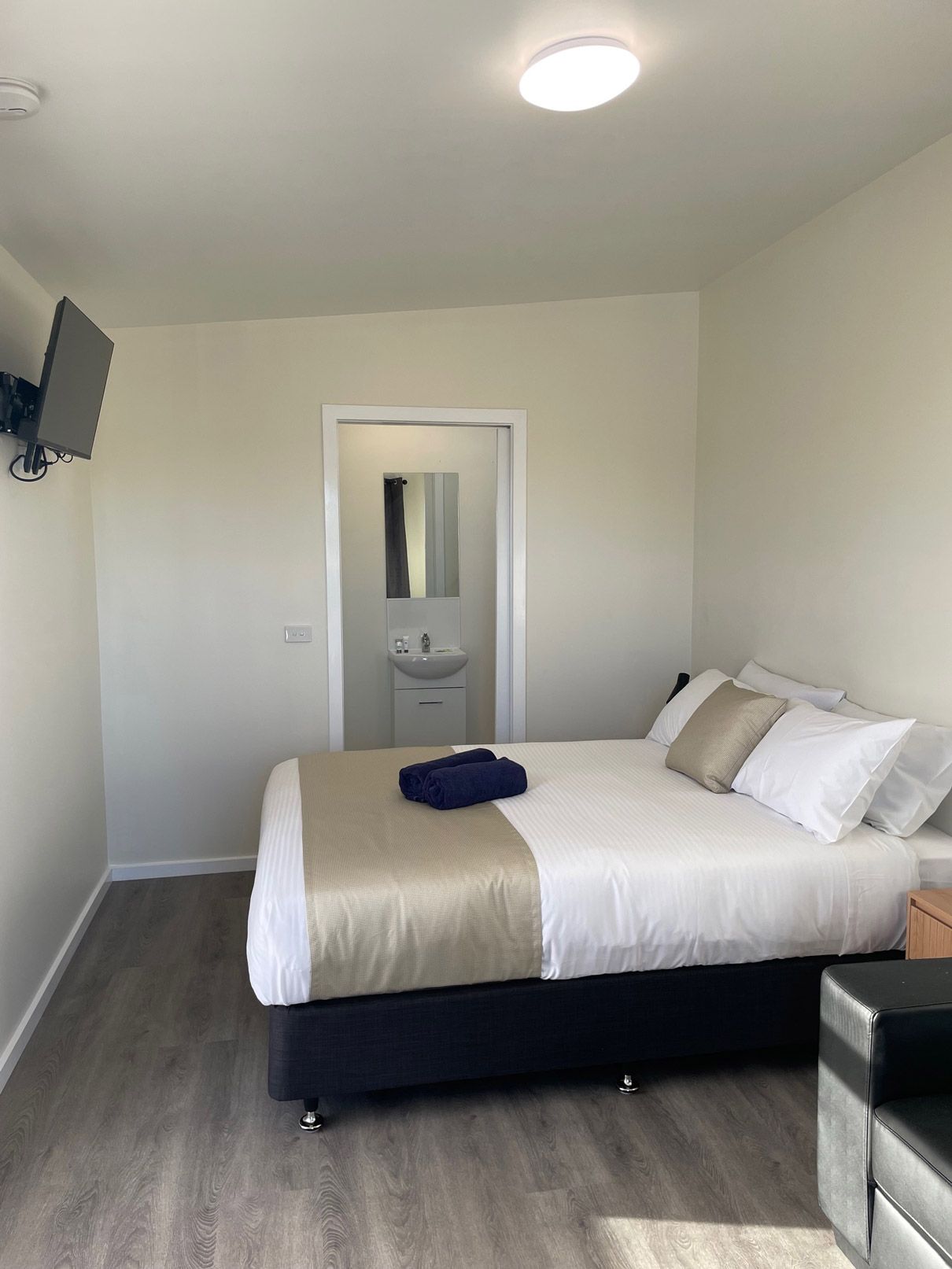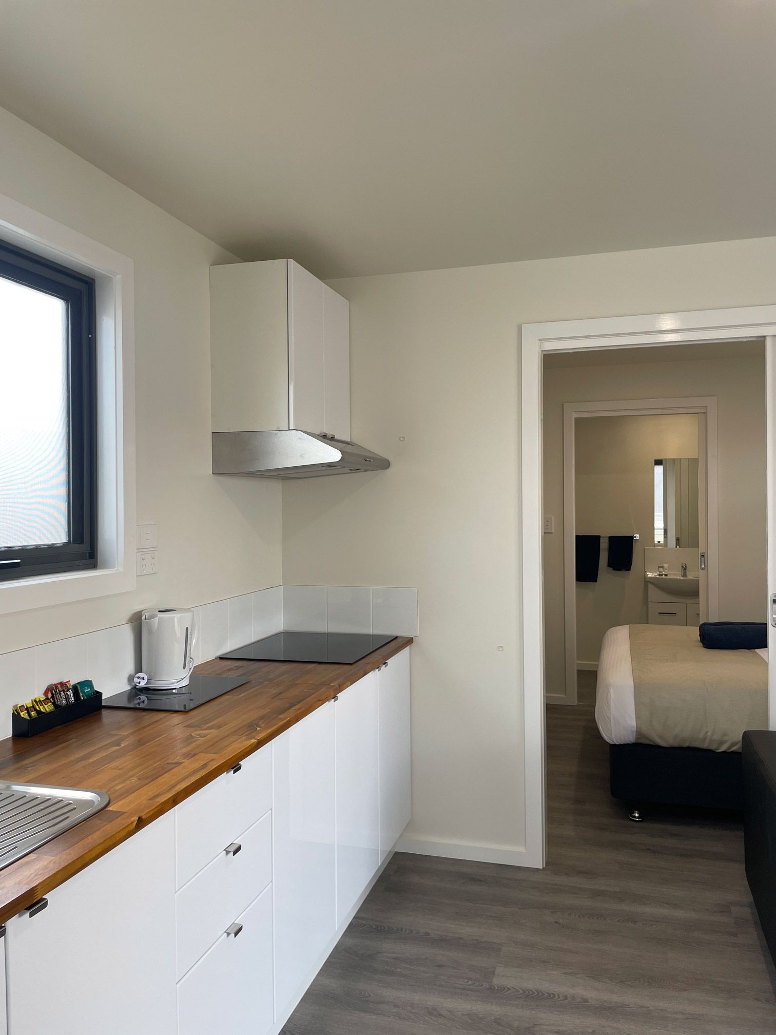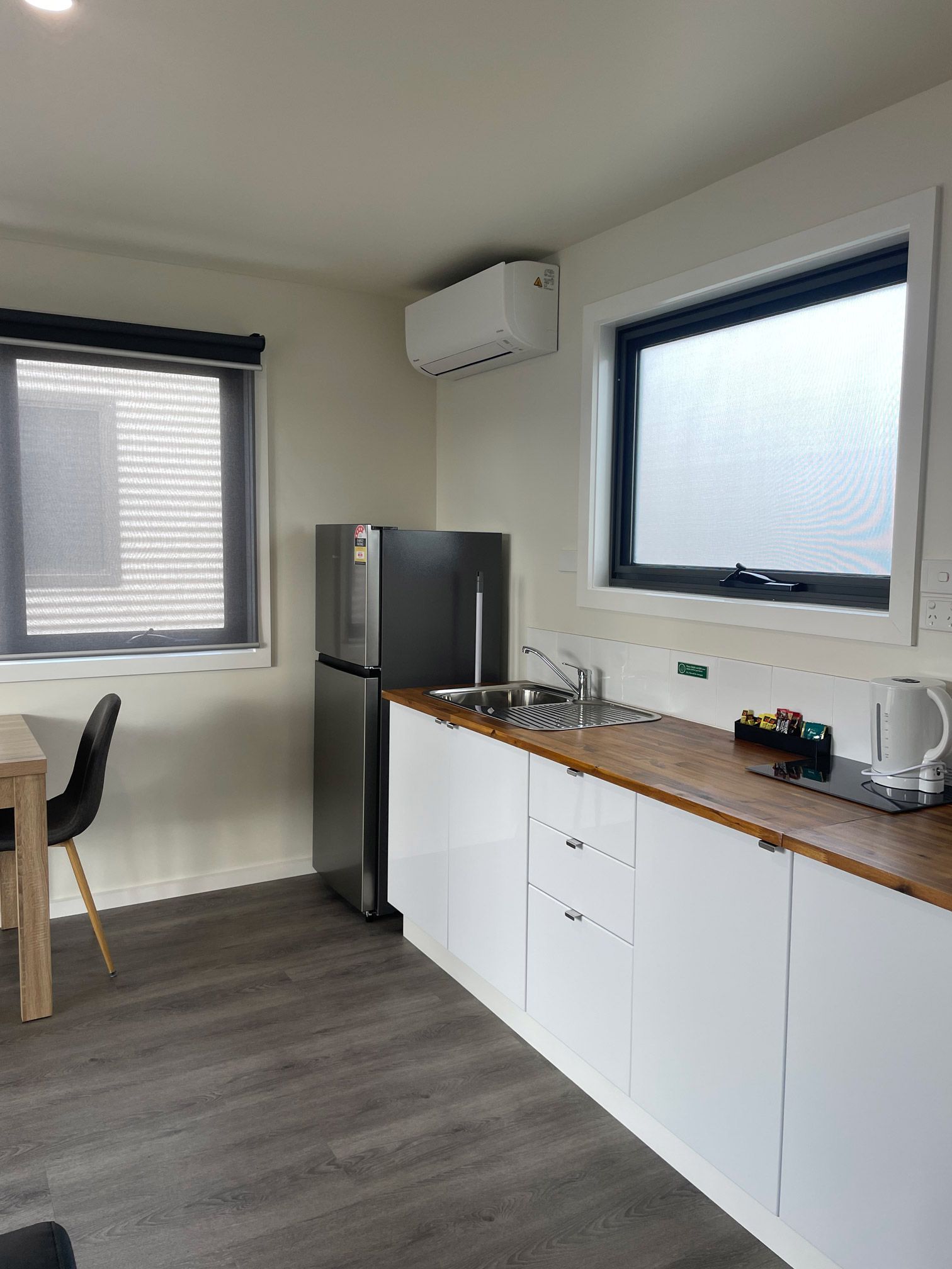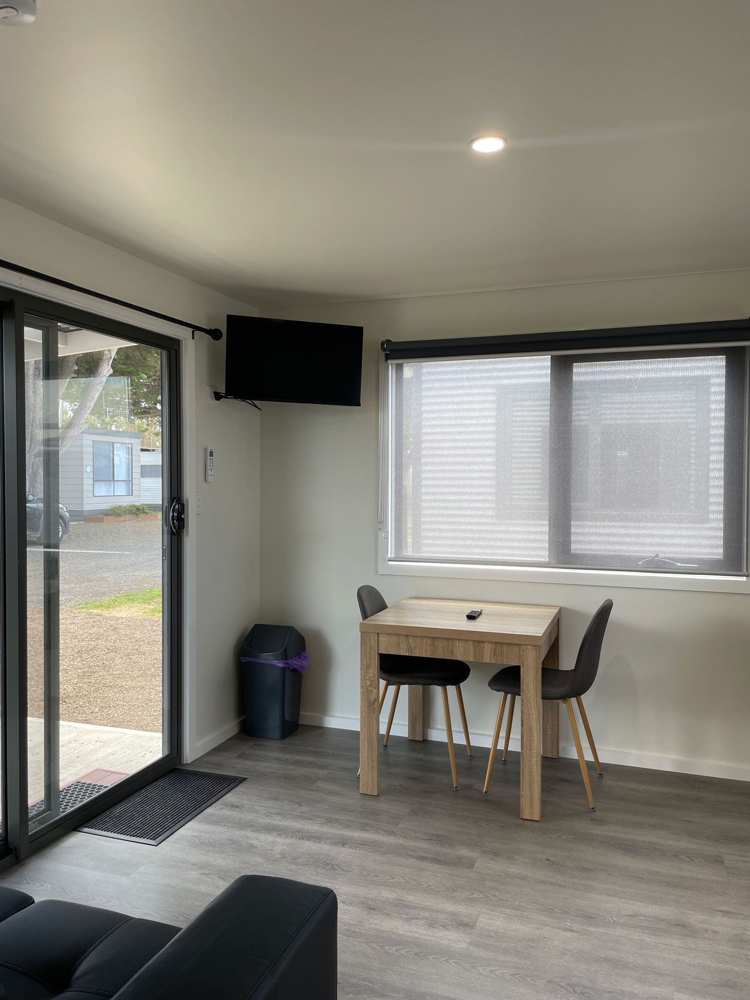 - This one bedroom cabin is ideal for couples or singles. Bedroom with queen bed and ensuite, separate lounge / kitchen /dining area with cooktop (no oven), microwave, fridge, toaster, tea / coffee making facilities, TV , couch, reverse cycle air con, front verandah with sitting area and pet friendly