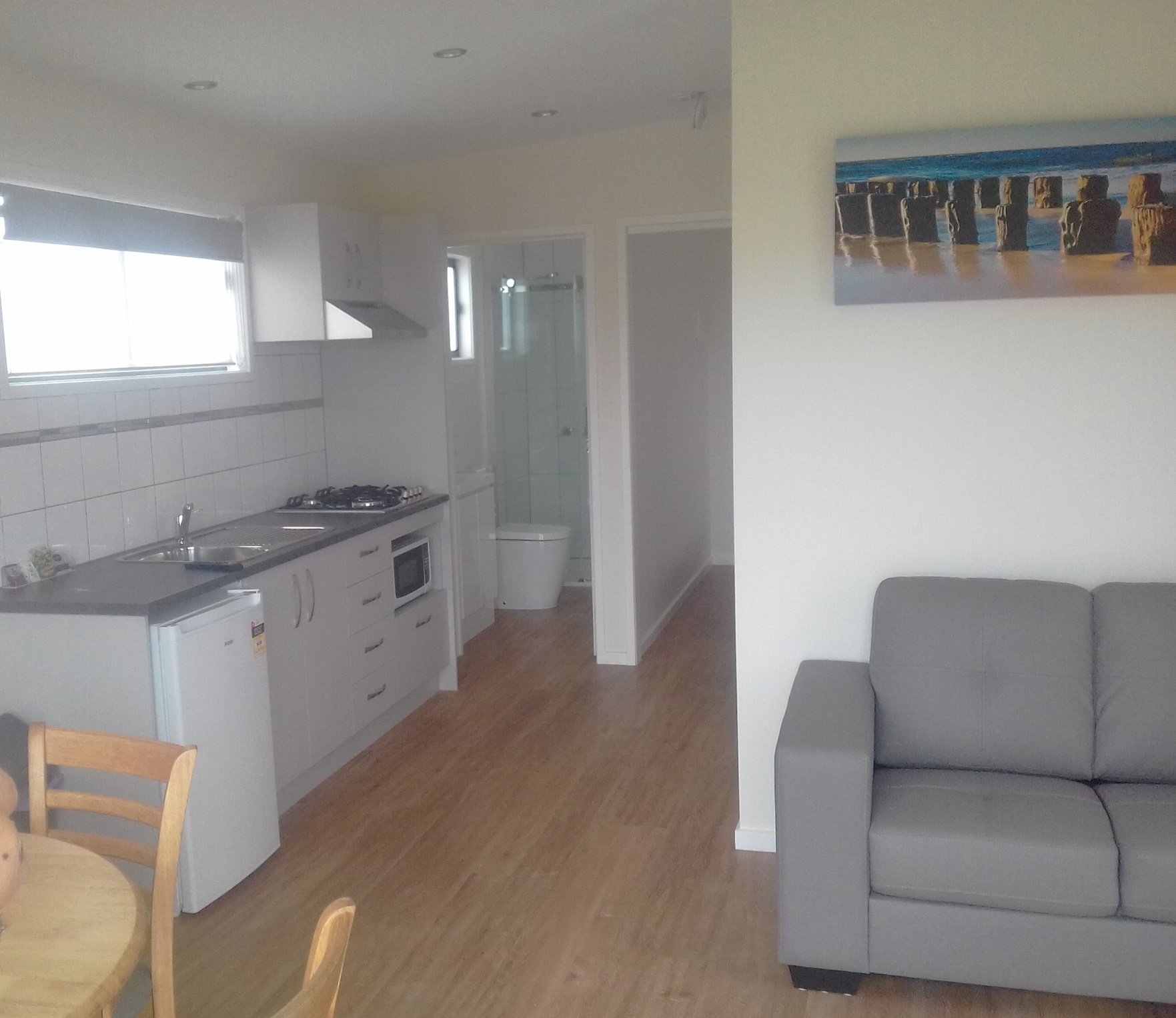 fully equiped kitchen with 4 burner cooktop and microwave oven and bar fridge